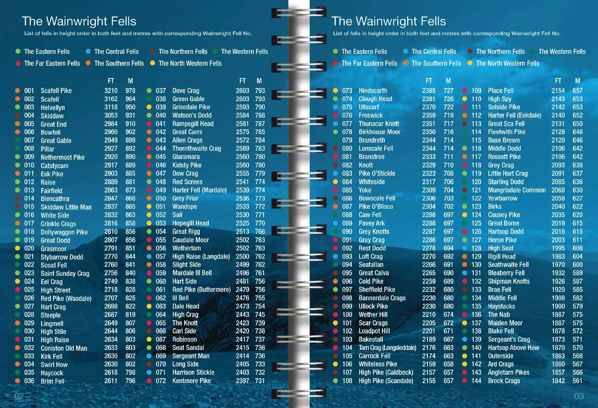 List of 214 Wainwright Fells. Shown in height order in both feet and metres.